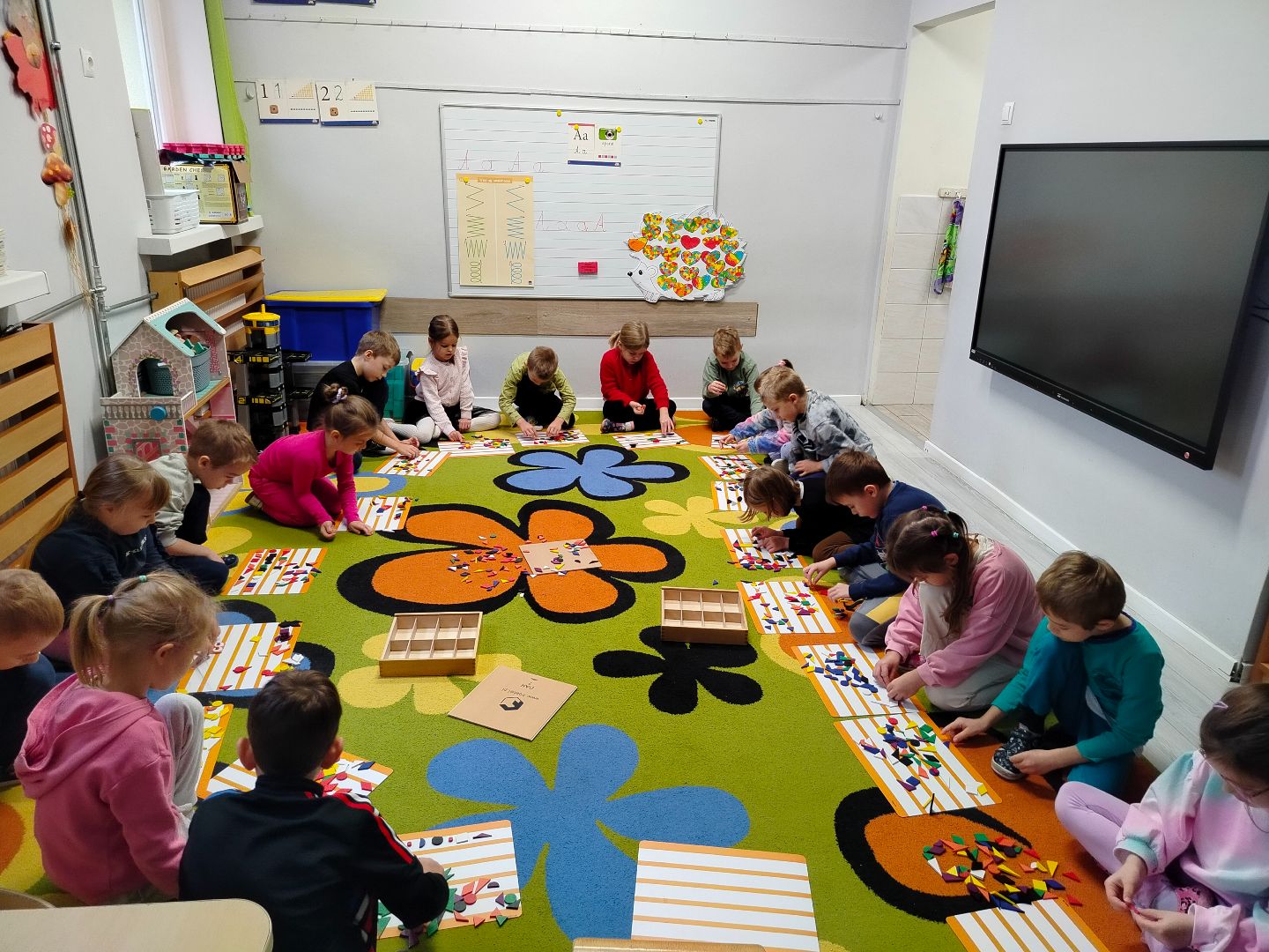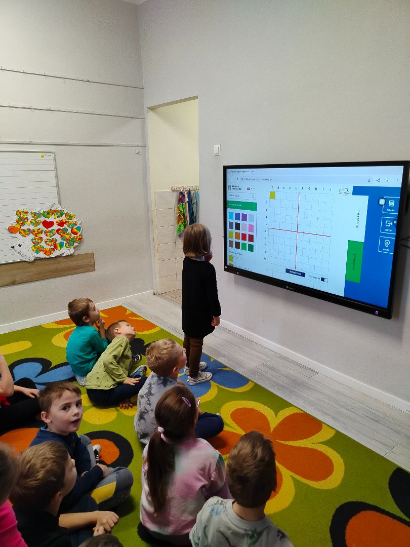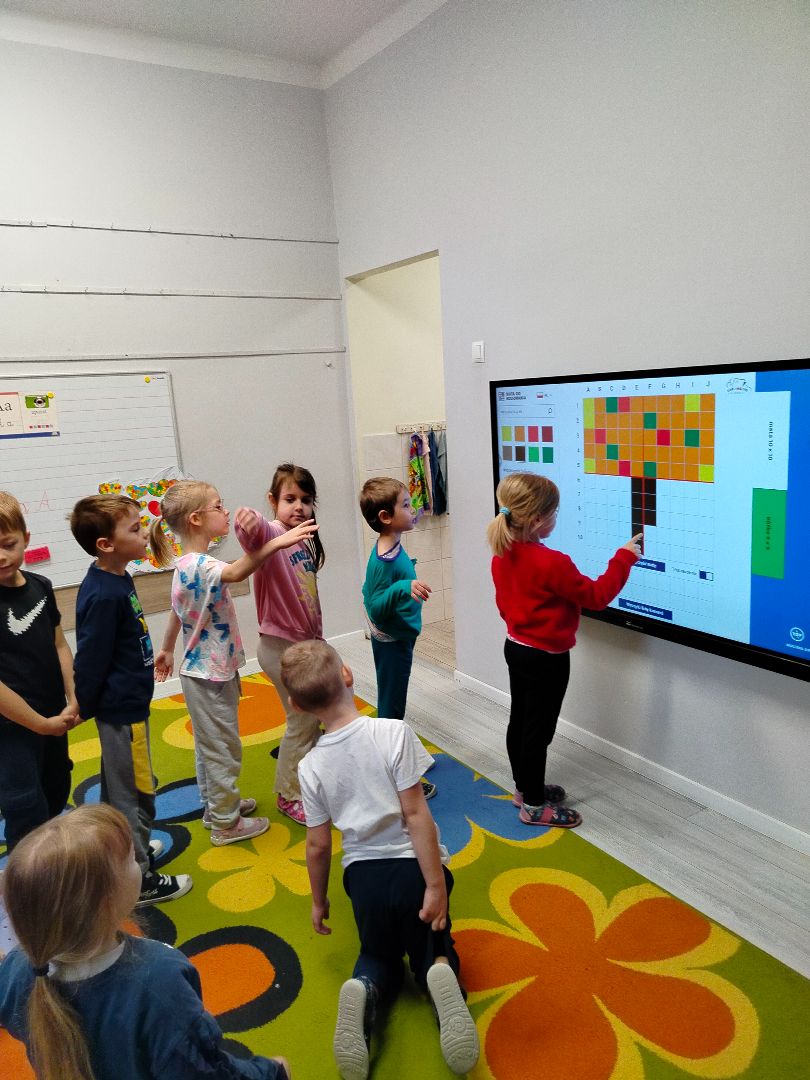 Nie brakuje też nowoczesnych technologii – tablica interaktywna pomaga dzieciom odkodować obrazki i rozwikłać logiczne zagadki.