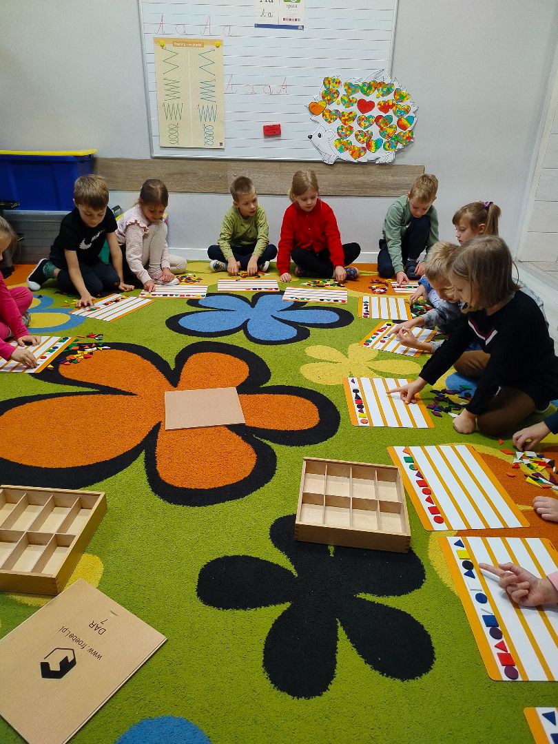 Podczas zajęć mali odkrywcy wykorzystują dary Froebla oraz naturalne skarby jesieni, tworząc własne, zakodowane wzory i układanki. 🍂🌰