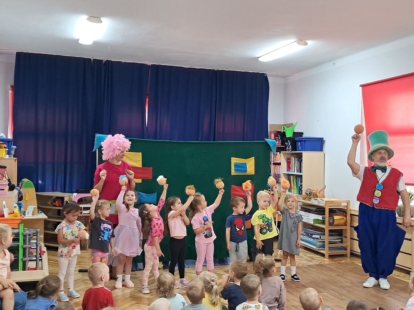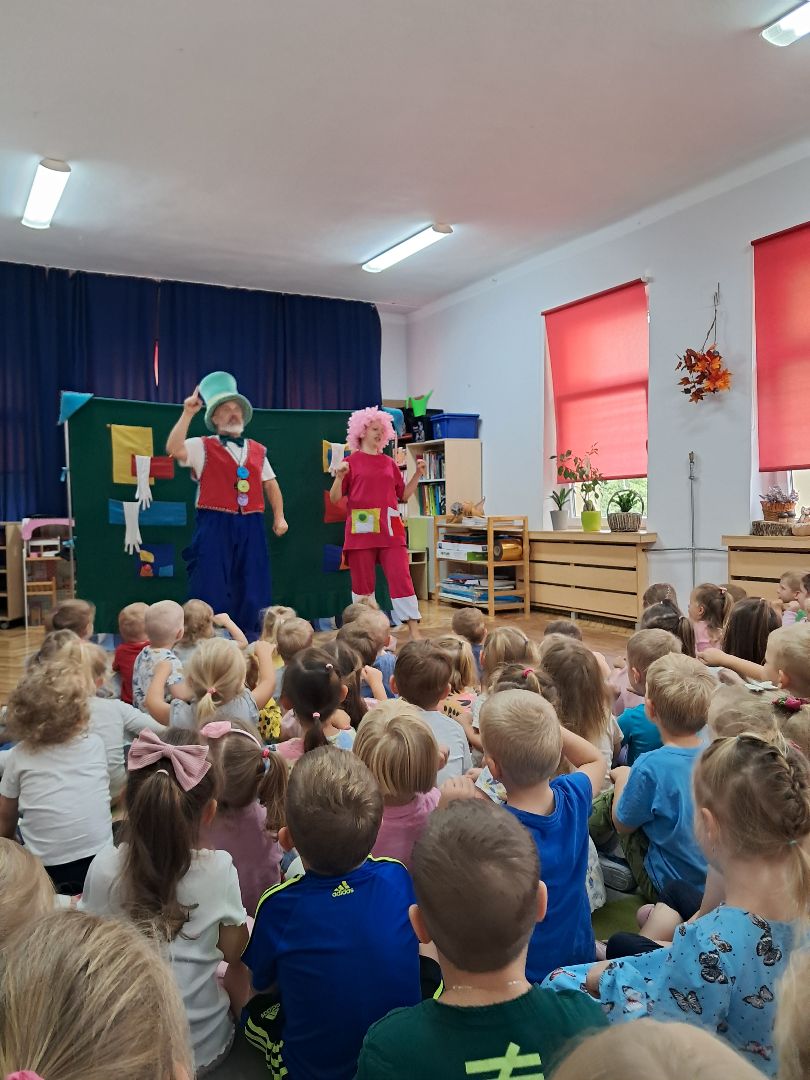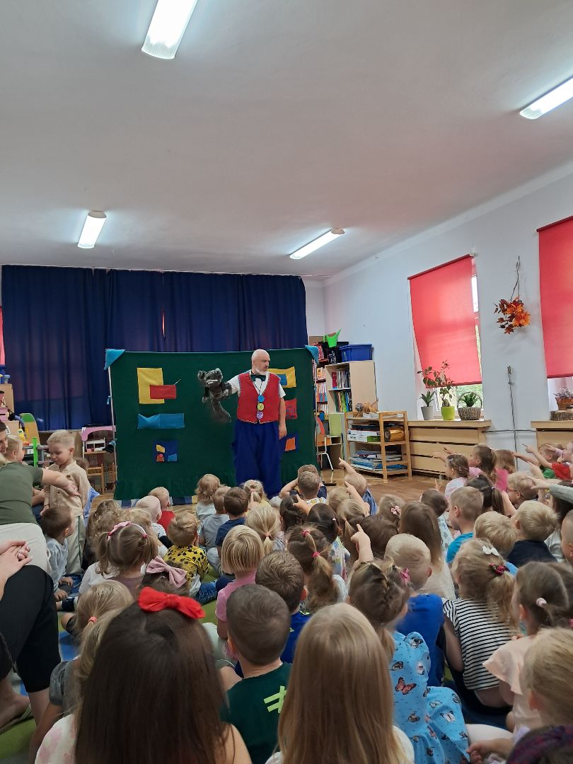 Dziś w naszym przedszkolu gościł Profesor Wyobraźni Hilary Szczebrzeszyński, który zaprosił dzieci w magiczną podróż na Archipelag Wysp Lalkowych. Uczestnicy zabawy przenoszą się na Wyspę Pacynek, gdzie zapoznają się z budową i sposobem animacji tego typu lalki. W spektaklu aktorzy odgrywają scenki z "Czerwonego Kapturka" Jana Brzechwy, historię przyjaźni pacynek Kropki i Kreski, uczestniczą w lalkowej klaunadzie. Przedstawienie ma charakter interaktywnej teatralnej zabawy.