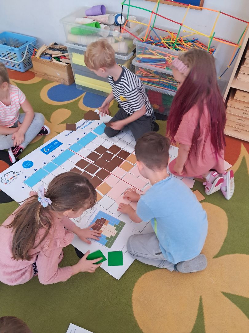 CodeWeek to inicjatywa promująca naukę kodowania…w różnym wieku i na różne sposoby. Skierowana do każdej zainteresowanej osoby. Bez żadnych barier, bez żadnych ograniczeń… z czerpaniem radości i spokojnym odczarowywaniem słowa „kodowanie”. Mądre Sowy wzięły udział w tej rozwijającej inicjatywie. Najpierw kodowały grzyby na macie wykorzystując kolorowe kartoniki, tzw. dyktando graficzne. Następnie zbierały owoce do koszyczka - układając ich drogę oraz zapisując ich kod. W poruszanym temacie dotyczącym zdrowia, kodowały apteczkę na dużej macie przy pomocy kubeczków oraz na małej macie używały kartoników.